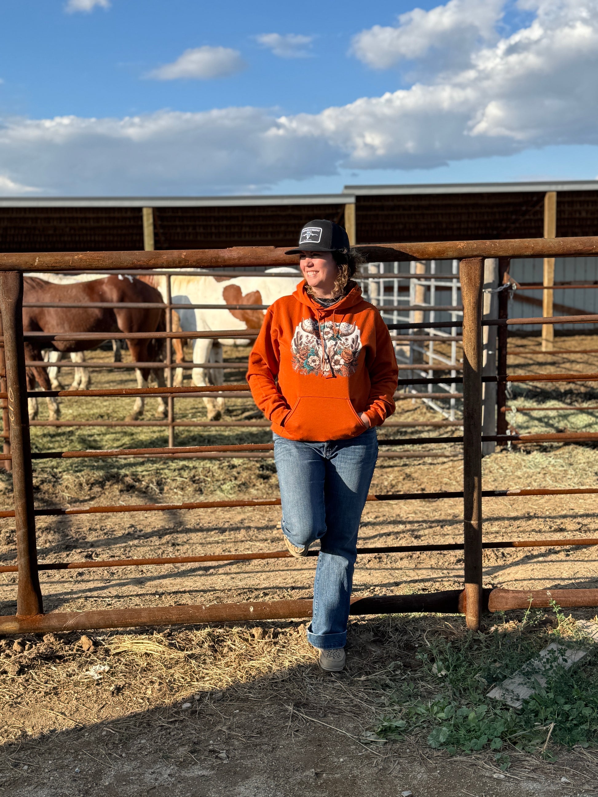 Stay warm and stylish this fall in our Rusted Fall Bloom Scull Burnt Orange Hoodie! This cozy and durable hoodie is perfect for looking great while getting things done. Whether you're doing chores or running after kids, this autumn hoodie has got you covered.